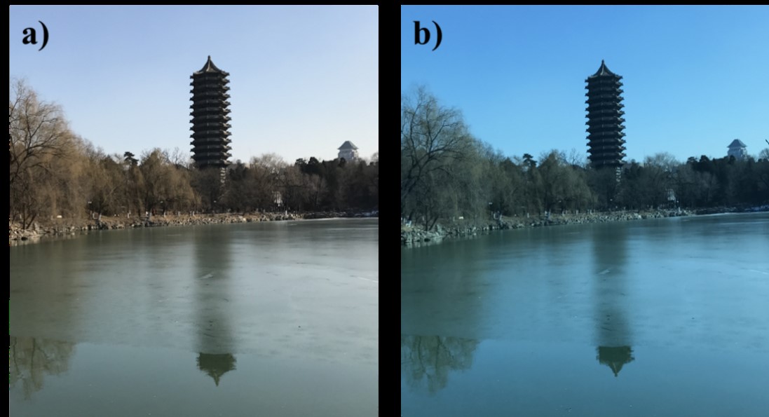 Photographs of Bo Ya Pogoda in Peking University taken with exactly the same camera settings on a sunny day: (a) without any filter; (b) with semitransparent device