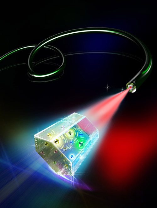Under infrared illumination, these SuperDots selectively produce bright blue, red and infrared light, with a staggering thousand times more sensitivity than existing materials. "Neither the glass of the optical fibre nor other background biological molecules respond to infrared, so that removed the background signal issue. By exciting these SuperDots we were able to lower the detection limit to the ultimate level - a single nanoparticle," says Jin.