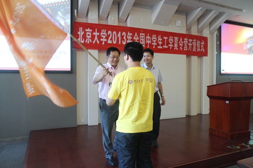 Current student Qi Zhou shared her study progress and life experience in COE since two years ago. Camper Xingshuo Liu from the High School of Peking University delivered a speech of anticipation about the Summer Camp. And finally, Dean Zhang presented the camp flags to the five classes.