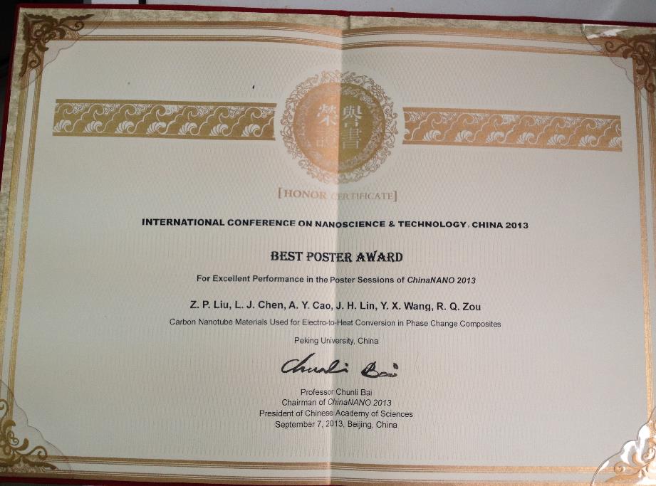 Professor Zou’s group has put forward that nano-porous materials can be used to encapsulate phase change materials for thermal energy storage. They have prepared several new kinds of phase change composites with excellent thermal stability, cycling performance, thermal conductivity, and high loading rate of phase change materials. The porous confinement can effectively overcome the leakage of solid-liquid phase change materials during phase change process. What’s more, Professor Zou’s group has firstly used phase change composites to realize light-to-heat and electricity-to-heat conversion. The work has created a new strategy for phase change materials applied on thermal energy storage. The research has been awarded “Best Poster Award” on the International Conference on Nanoscience & Technology, China 2013, which has been spoken highly of by other experts.