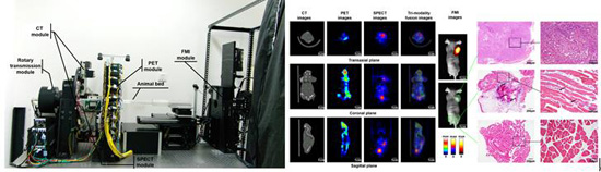 By enabling the visualization of the physiological and pathological processes at the cellular and molecular level in living organisms, molecular imaging has already become a key method to study and diagnosis of diseases, such as cancer, neurological and cardiovascular diseases. Several molecular imaging modalities, including Positron Emission Tomography (PET), Single Photon Emission Computed Tomography (SPECT) and Fluorescence Molecular Imaging (FMI), are widely used in the research and clinical applications. However, it is desired to use multiple molecular imaging methods to trace and monitor multiple molecular targets to study the complicated life phenomena. However, most current imaging systems are single modality or dual modalities, which could not meet the increasing demand in the field of biomedical research and clinical imaging.