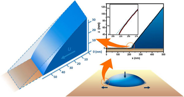 Professor Hao Wang from the Department of Energy and Resources Engineering, College of Engineering has made an important progress in dynamic wetting. The results titled “Convex Nanobending at a Moving Contact Line: The Missing Mesoscopic Link in Dynamic Wetting” have been published on line in the famous journal ACS Nano (IF 12).