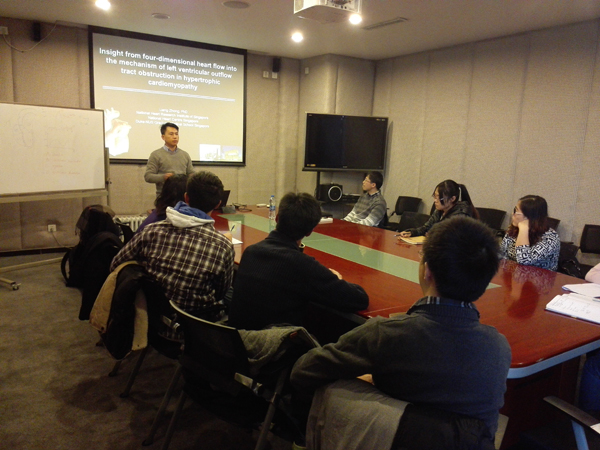 On December 12, 2014, invited by the Department of Mechanics and Engineering Sciences, Dr. Liang Zhong from National Heart Center Singapore (NHCS) gave a seminar entitled “Insight from four-dimensional heart flow into the mechanism of left ventricular outflow tract obstruction in hypertrophic cardiomyopathy” to the College of Engineering at Peking University. Associate Professor Ceji Fu hosted the event.