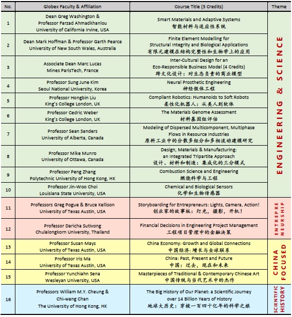 This year, to enhance students’ global and professional experience, the Globex Julmester will offer courses that focus on the core elements of our generation: engineering & science, engineering finance & entrepreneurship and society & globalization. Engineering and science generate new knowledge and skills for society to advance and prosper (10 engineering/science courses). To convert into useful products, the acquired knowledge and skills need to be commercialized through innovation and entrepreneurship (2 engineering finance & entrepreneurship courses). Societies are being profoundly impacted by China, as it grows to become the world’s largest economy, so Globex offers students an opportunity to study China and its peoples (3 China focused courses). Finally, there’s a course which covers a scientific journey of over 14 billion years of history to help students learn from their past as they move forward into the future.