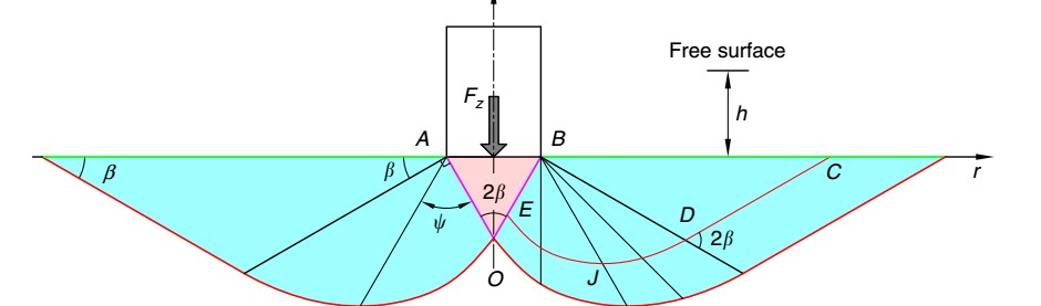 Figure 1. The theoretical model of an object intruding granular material. There exists a conical stagnant zone (pink region AOB) ahead of the intruder, and a plastic region (cyan region) around them.