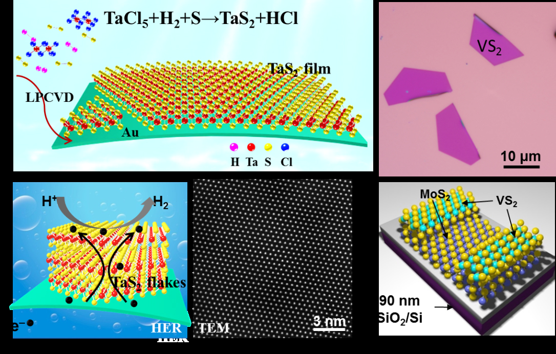 Left panel: Schematic illustration of the LPCVD growth process of 2H-TaS2 thin films on Au foils, the HER process of 2H-TaS2/Au foils, and the atomic-resolution TEM image of 2H-TaS2. Right panel: Optical microscopy image of VS2 flakes synthesized on SiO2/Si through an APCVD route, and the schematic model of VS2-contacted monolayer MoS2 device.