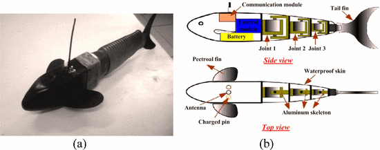 Multilink biomimetic robotic fish. (a) The prototype. (b) The side view and top view.