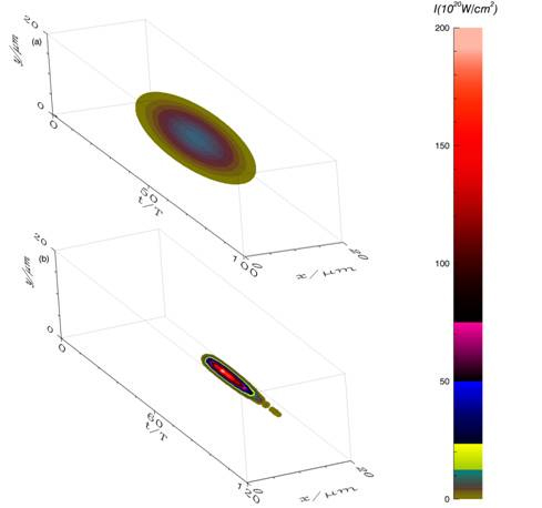 Fig.1 Energy distribution in 3D space(upper) and after shaping by the laser plasma lens (down)