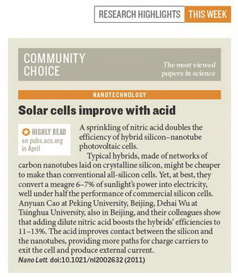 Recently, Nature also highlighted this research in an article titled “Solar Cells Improve with Acid.” The article said: “A sprinkling of nitric acid doubles the efficiency of hybrid silicon-nanotube photovoltaic cells. Typical hybrids, made of networks of carbon nanotubes laid on crystalline silicon, might be cheaper to make than conventional all-silicon cells. Yet, at best, they convert a meager 6-7% of sunlight’s power into electricity, well under half the performance of commercial silicon cells. Anyuan Cao at Peking University, Beijing, Dehai Wu at Tsinghua University, also in Beijing, and their colleagues show that adding dilute nitric acid boosts the hybrids’ efficiencies to 11-13%. The acid improves contact between the silicon and the nanotubes, providing more paths for charge carriers to exit the cell and produce external current.”