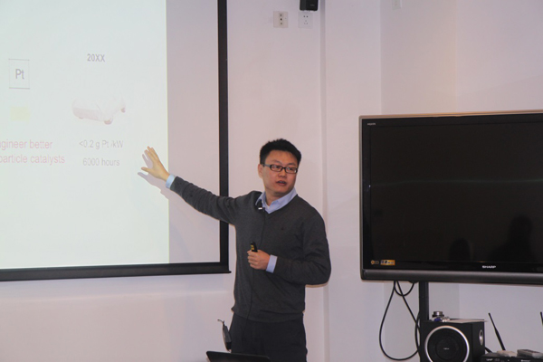 In the seminar, Xu talked about engineering AuPt nanoparticle surface for fuel cell and Li-air battery. He introduced the methods for determining the Pt coverage and surface composition. He also demonstrated a method to precisely control the surface composition of AuPt bimetallic nanoparticles using a surface energy manipulation strategy. With these AuPt nanoparticle catalysts, his group conducted a systemic study on the dependence of the methanol oxidation and CO oxidation activities on the surface composition. It was found that using these AuPt catalysts can lower the overpotential during the charge and discharge processes of Li-air battery. In addition, stabilizing Cu nanoparticles by alloying with Au and using them for electrochemical reduction of carbon dioxide was also presented.