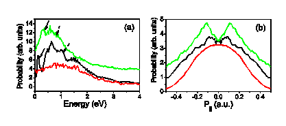 Low energy photoelectron energy spectrum (a) and longitudinal momentum distribution (b) calculated using numerical solution of TDSE for Xe (black line) and short-range potential (red line). Calculated result using a hydrogen-like potential with the same ground state energy of Xe is also shown (green line).