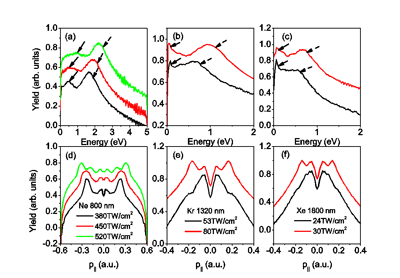 Low energy photoelectron energy spectra and longitudinal momentum distributions of Ne ((a) and (d)), Kr ((b) and (e)) and Xe ((c) and (f)) in infrared laser fields.