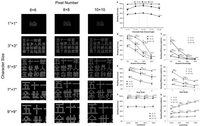 Visual prostheses offer a possibility of restoring useful reading ability to the blind. To achieve optimal Chinese reading performance, Ren and his team examined the reading accuracy and efficiency of pixelized Chinese paragraphs. They tested 40 native Chinese speakers with normal or corrected visual acuity (20/20) in four experiments, measuring ready accuracy and efficiency while altering character resolution, character size, pixel dropout percentage, number of gray levels, and luminance.
