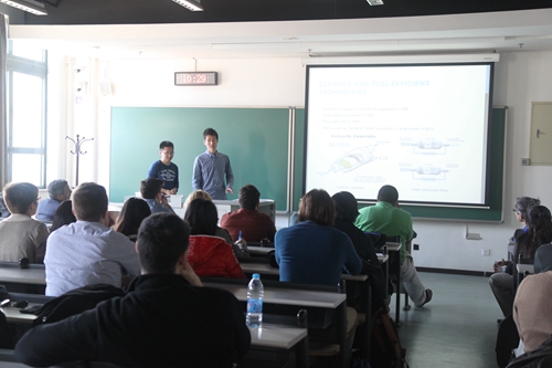 After that, one design group of Capstone Design project from College of Engineering demonstrated their self-driving car project and introduced its corresponding business model design, infrastructure, laws and regulations. Considering several shortcomings of the traditional fuel vehicle such as air pollution, traffic congestion due to low efficient in interior space utilization and man-made traffic accidents, the self-driving car project is to design more clean vehicles as well as the higher efficient and smooth road traffic system. This project will be completed by students from three universities (Pekingng University, University of Toronto and University of California, Irvine). Mr. Jia Lu and Yibo Wang, undergraduate students from Peking University, illustrated the business model and navigation algorithms design of this project to all faculty and students.