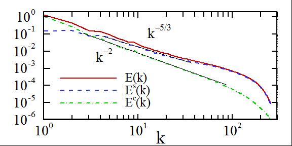 Right: Kinetic energy spectrum and its solenoidal and compressive components.