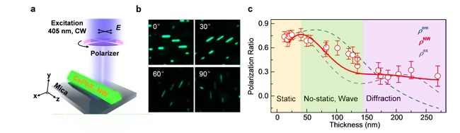 Figure a. Polarization measurement configuration of CsPbX3 nanowires. b. Optical PL images of 15-nm-thick CsPbBr3 nanowires at different polarization directions (0°, 30°, 60°, 90°). c. Scaling law of polarization ratio of CsPbBr3 nanowires with different thickness.