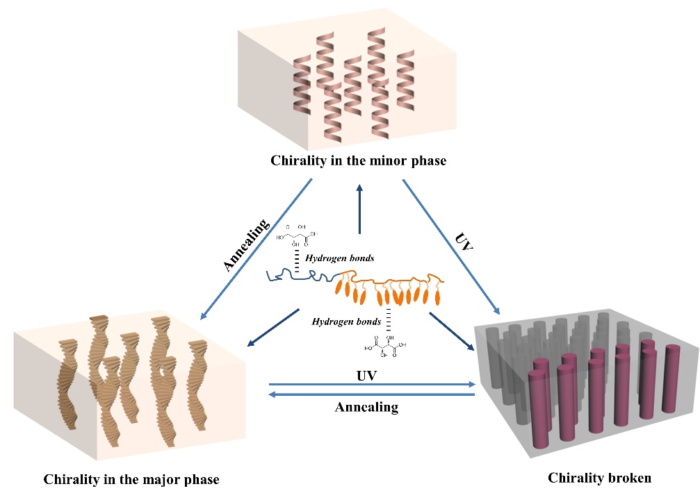Another strategy to fabricate hierarchical nanostructures in LCPCs in a reliable and simple way is doping. Here, dopants serve as the hydrogen bond donors and liquid-crystalline polymers serve as the hydrogen bond acceptors. The selected dopants could interact with both blocks of the LCBC through hydrogen bonding. The chirality of the dopants could also be transferred though the supramolecular interactions and furtherly influence the self-assembly of the liquid-crystalline polymers. Chirality would be firstly transferred to the minor phase of the LCBC because of their good compatibility, inducing helical nanostructures. Optimizing several factors such as thermal treatment condition and contents of dopants could lead to further chirality transfer and generate aggregation chirality in the major phase.