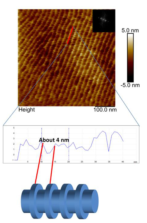 Based on their previous research, Professor Yu’s group designed a series of urethane linkage containing liquid-crystalline block copolymers (LCBCs) with azobenzene mesogens in side chain. Urethane linkage could form strong hydrogen bonds with both the dispersed phase and the continuous phase on microphase-separation of the LCBCs. The supramolecular interactions and the interference with the two blocks of the LCBCs significantly affected the crystallization of the component in the dispersed phase when the LCBC was annealed from its isotropic phase to room temperature, resulting in a polymer domain where the amorphous and crystallized regions coexisted in the separated nanocylinders. As a result, the fabrication of sub-10 nm hierarchical nanostructures has been realized based on the hydrogen bonding in the LCBCs themselves without any other dopants. (Figure 1) The above work has been published in Macromolecular Rapid Communications.