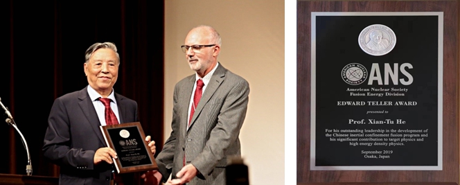 Edward Teller Award, set up by American Nuclear Society, is the highest international award of fusion energy which was named after Edward Teller, father of the hydrogen bomb. Academician Xian-Tu He was awarded this prize for his great contribution on the use of lasers and ion beams to generate high temperature and dense matter in the field of controlled nuclear fusion.