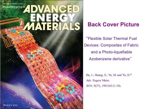 Furthermore, Haifeng Yu’s group recently develops a solid-state STF device which is designed and fabricated by compositing one photo-liquefiable azobenzene (PLAZ) derivative with a flexible fabric template. The photoinduced phase transition of the PLAZ derivative enables the charging of the flexible STFs to be totally solvent-free and helps improving the energy-storage capacity of the azobenzene-based STFs. The fabric template not only helps increasing the energy density, but also prolonging the energy-storage half-life of flexible STFs comparing to the pristine PLAZ STFs. One infrared camera was used to visually demonstrate the exothermic situation of the flexible STF device under different stimuli. (Advanced Energy Materials, 2019, 9(37), 1901363(1-10). Back cover)