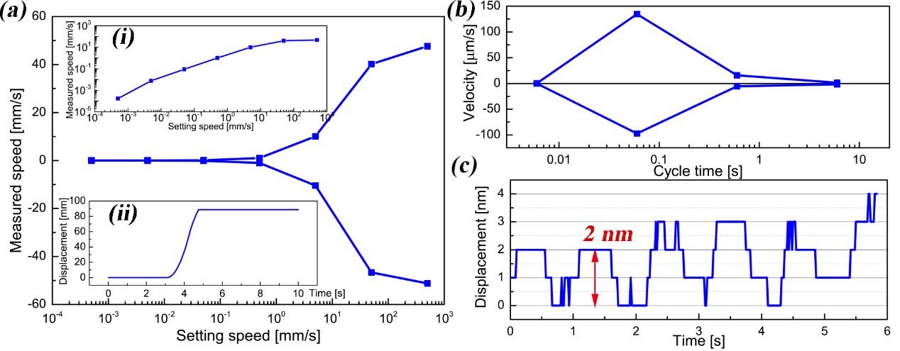 Figure 2. Test results of Dual Mechanism Multimodal Linear Linear Actuator: (a) electromagnetic macro-motion with maximum operating speed of 51.2 mm/s; (b) piezoelectric step micro-motion; (c) piezoelectric servo nanoscale motion with the minimum displacement resolution of 2 nm.