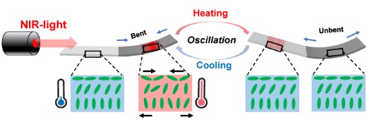 Inspired by the biological system in nature, Huai Yang’s group judiciously designed and fabricated by selectively coating a mussel-inspired polydopamine (PDA) polymer layer on the surface of the splay-aligned liquid crystalline network (LCN) film. By selectively coating the PDA layer of the LCN film, the near-infrared light-driven oscillation of the LCN film was obtained because of the photothermal effect from PDA coating and self-blocking effect of the polymer matrix. As shown in Figure 1.
