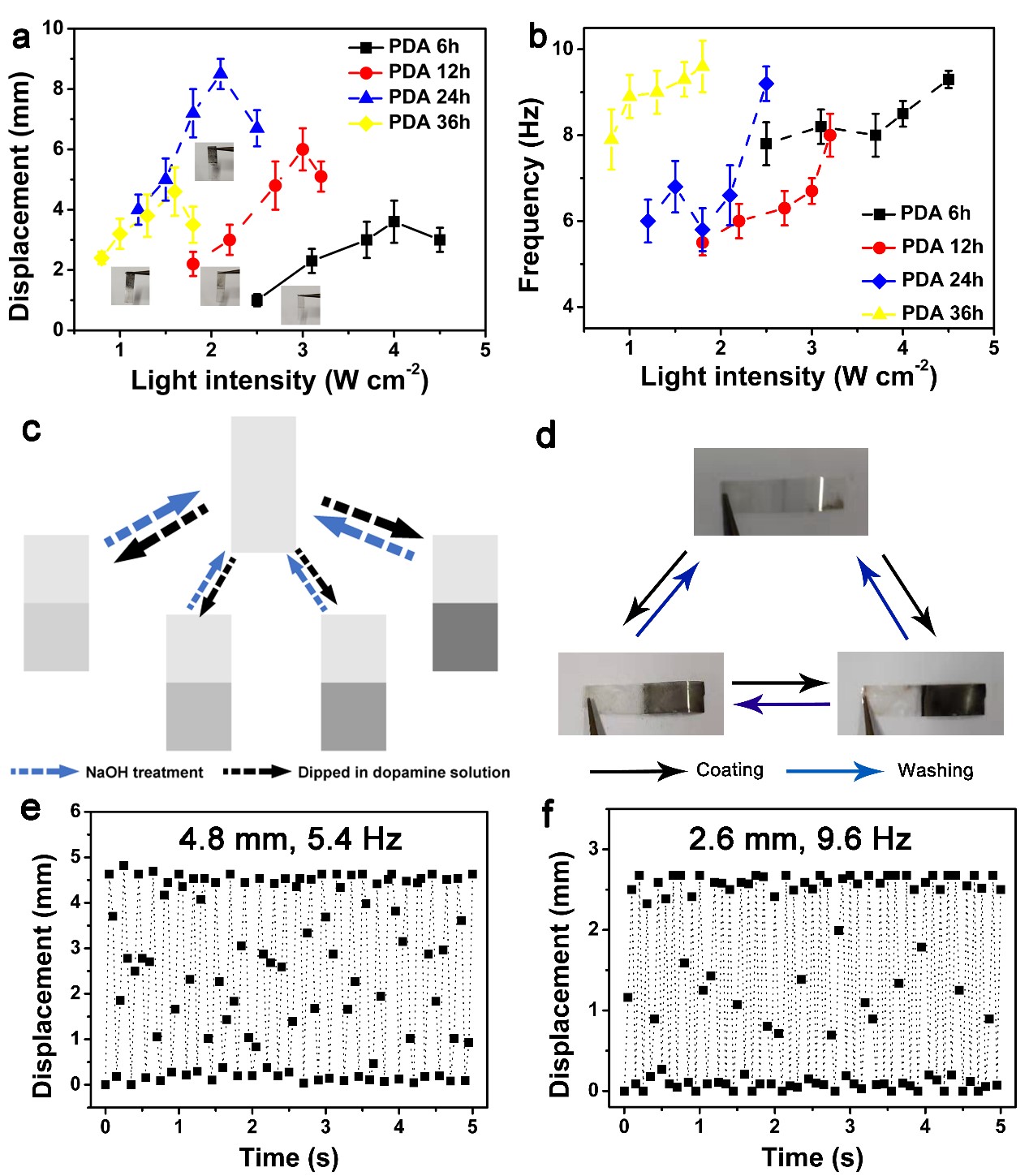 The oscillating motions of the LCN oscillators can be facilely manipulated by tuning light intensity and film thickness (Figure 2a and 2b). More importantly, the programmability of the PDA coating enables the oscillating behaviors of LCN film to be predesignated and finely adjusted by coating the film with PDA locally and repeatably. It overcomes the shortcomings of the conventional LCN actuators that the modification of the materials has to be operated at the very beginning of the preparation, providing a greener strategy in fabrication of functional LCN oscillators. The programmability of the PDA-coated LCN film was presented in Figure 2c-f.
