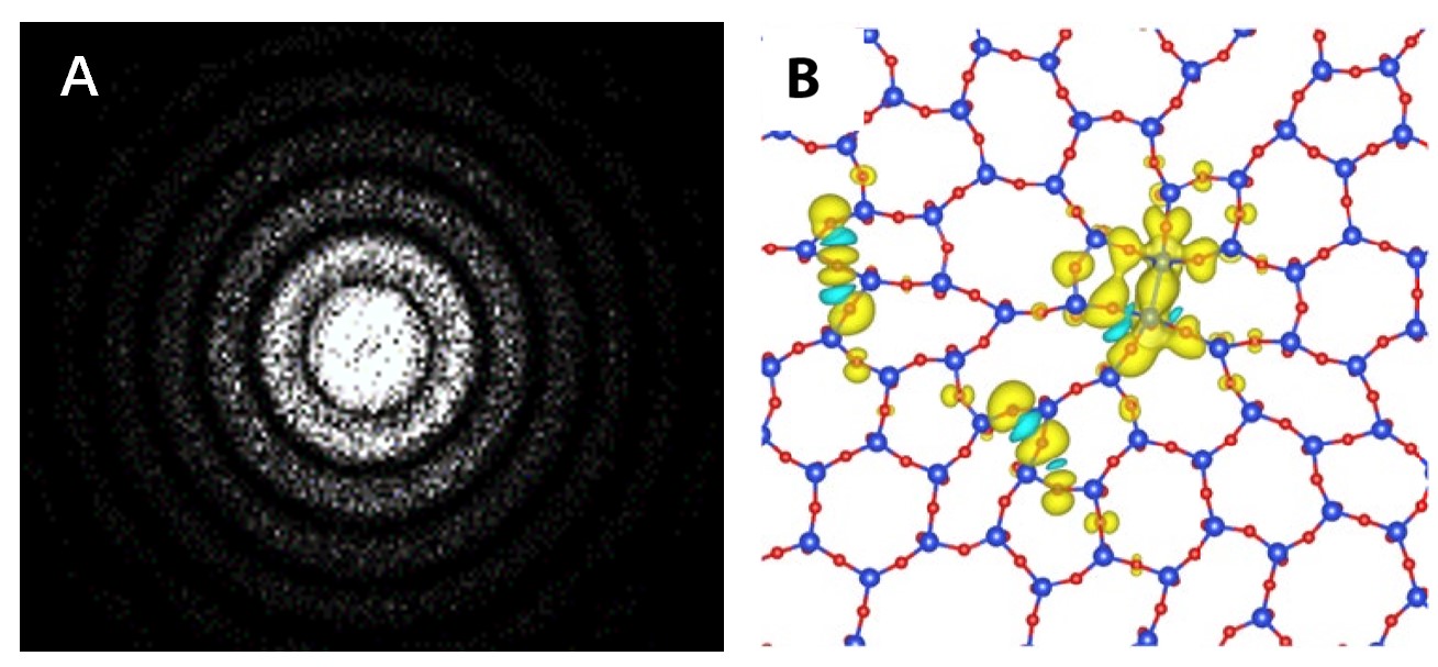 Fig. A: Power spectra of two-dimensional SiO2 that has a disordered hyperuniform state. B: Electron density around the Fermi level of two-dimensional SiO2 that has a disordered hyperuniform state. The blue and red atoms depict Si and O atoms, respectively.