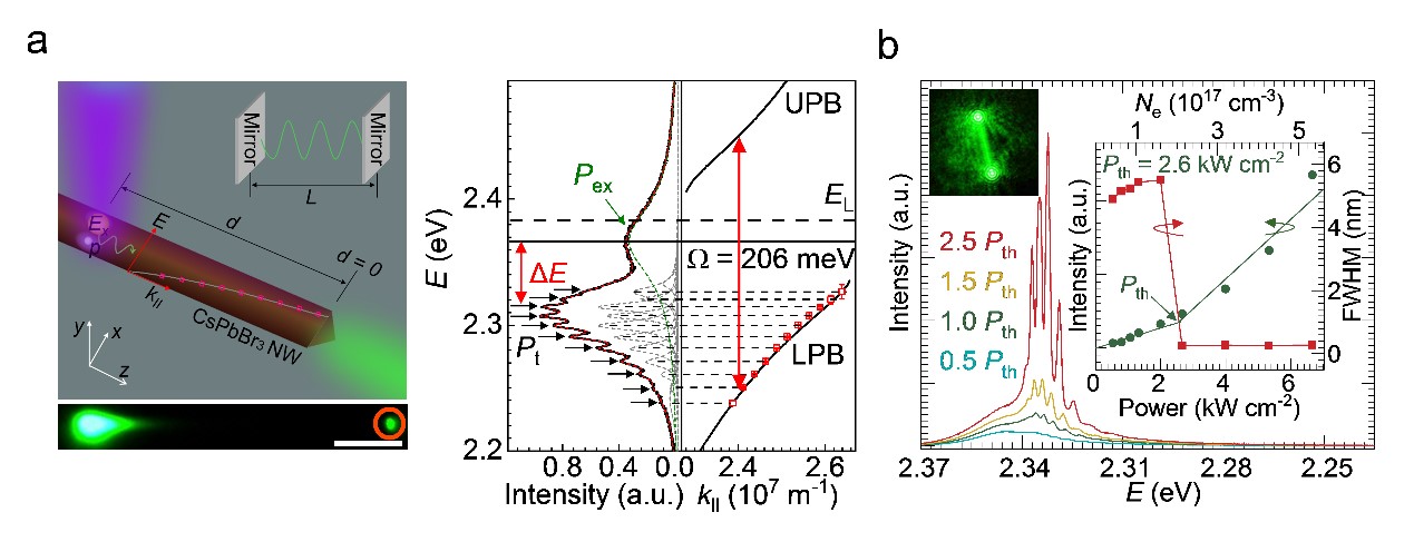 Fig. a. left: schematic diagram of EP propagating in one-dimensional CsPbBr3 nanowire; right: distal PL spectrum measured by spatial-resolved photoluminescence spectroscopy and corresponding dispersion curve of EP. b. CW pumped microlaser in CsPbBr3 nanoribbon-sapphire configuration.