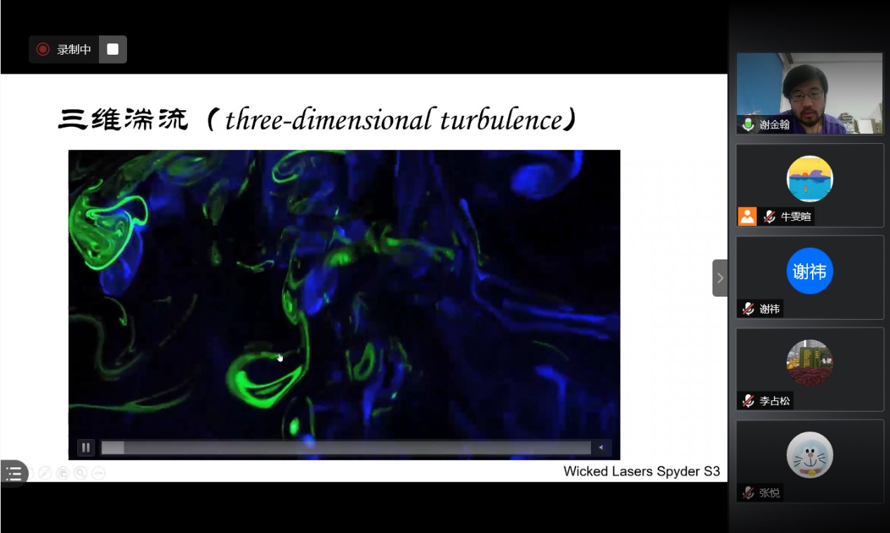 In the third talk, Assistant Prof. Shengkai Wang discussed a small problem in daily life related to turbulence, namely fluid mechanics in sneezing. He introduced some wonderful optical measurement techniques in contemporary fluid mechanics research. He showed an animation of people sneezing without wearing a mask and wearing a mask, showing the audience the different fluid movement under the optical measurement of the flow field.