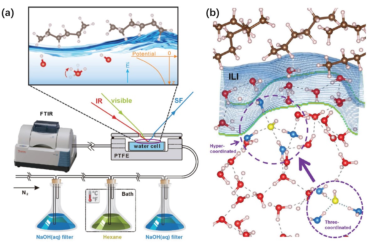 Figure (a) Experimental setups of surface-specific sum-frequency vibrational spectroscopy (SFVS) technique. (b) Snapshot of OH- ions at the hydrophobic interface.