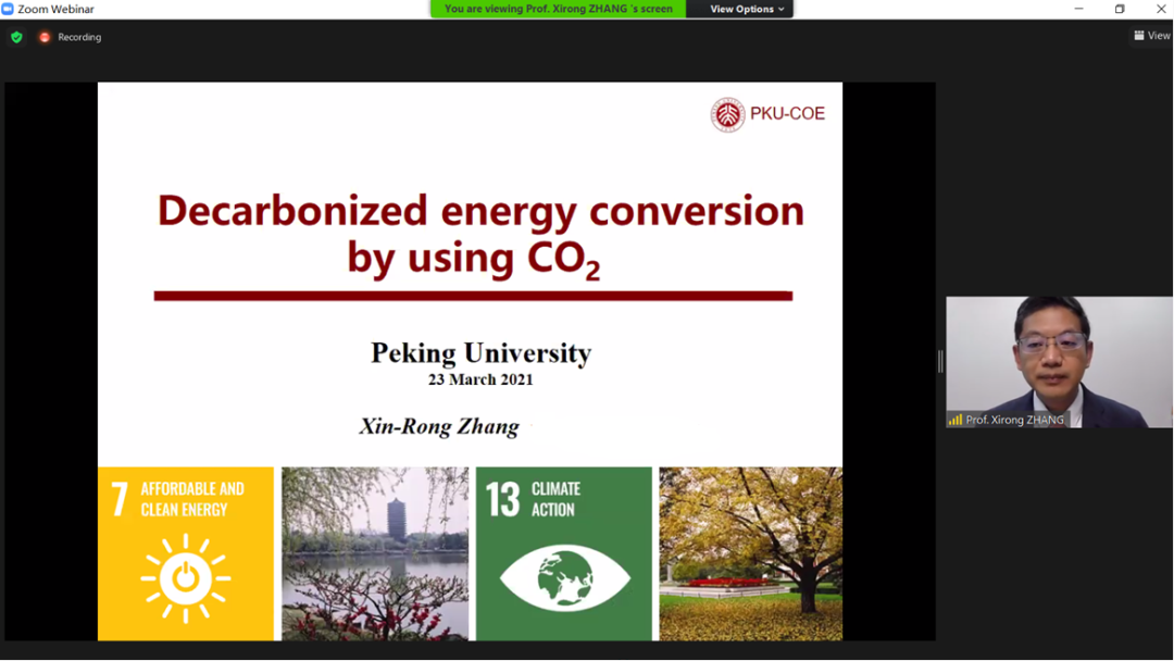 In the symposium, assistant professor Hancheng Dai in the College of Environmental Science and Engineering at Peking University introduced the vast impact of climate change and explored the chances and risks faced by human society in the areas of health, economy and energy system. After that, Professor Xinrong Zhang in the College of Engineering shared his research team’s recent discovery in decarbonized energy conversion and introduced the utilization technology of CO2 in the heating and cooling process and its function in improving air quality.